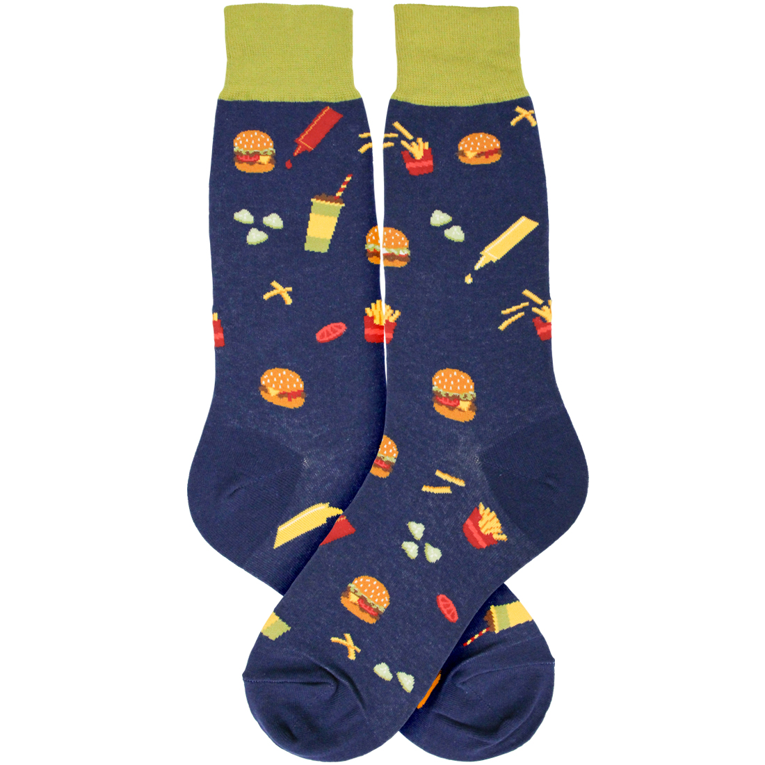 Yum! Burgers, fries, pickles, mustard, ketchup, and a beverage are the perfect treat for your feet! A fun men's sock design of a burger binge will bring a smile to your face and most likely a trip to your favorite burger joint. These funny men's socks will brighten any outfit, any day, whether just for yourself or to impress your family, friends, or co-workers.