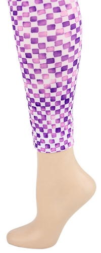 Semi-opaque microfiber footless tights with small squares in fun watercolor shades of purples and pinks alternate with white to make up this fashion checkerboard design.